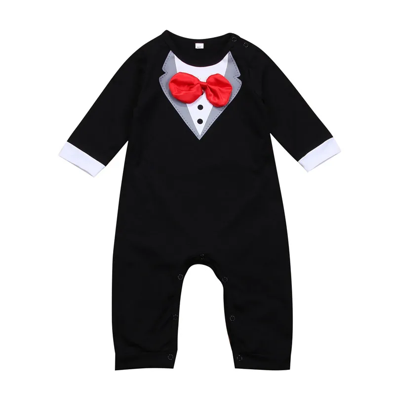 0-24 Months Baby Boys Rompers Long Sleeve Bow Tie Baby Boys Jumpsuit Black White Gentleman Formal Newborn Clothes Playsuit